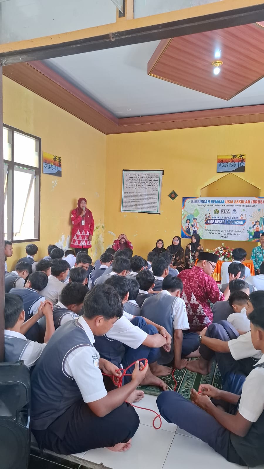 Siswa Muslim: Berkumpul di Mushola sekolah dengan pendampingan dari tim penyuluh KUA Kecamatan Getasan. Materi difokuskan pada penguatan akhlakul karimah dan pencegahan pernikahan dini.
